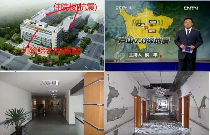 我国首栋承受7级大地震考验的隔震建筑为芦山县人民医院新门诊综合楼,震后医疗设备完好,成为震后紧急避难及医疗救治中心。而数米之外采用抗震技术的住院楼,建筑和医疗设施破坏严重。